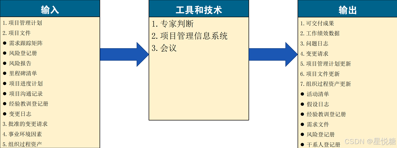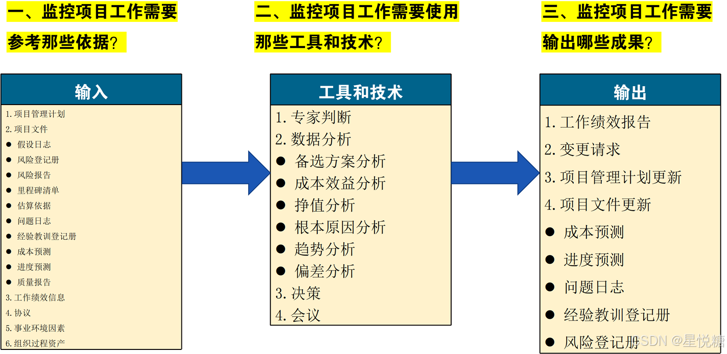 (1)输入--项目管理计划:任一组成部分都可作为监控项目工作过程的输入;