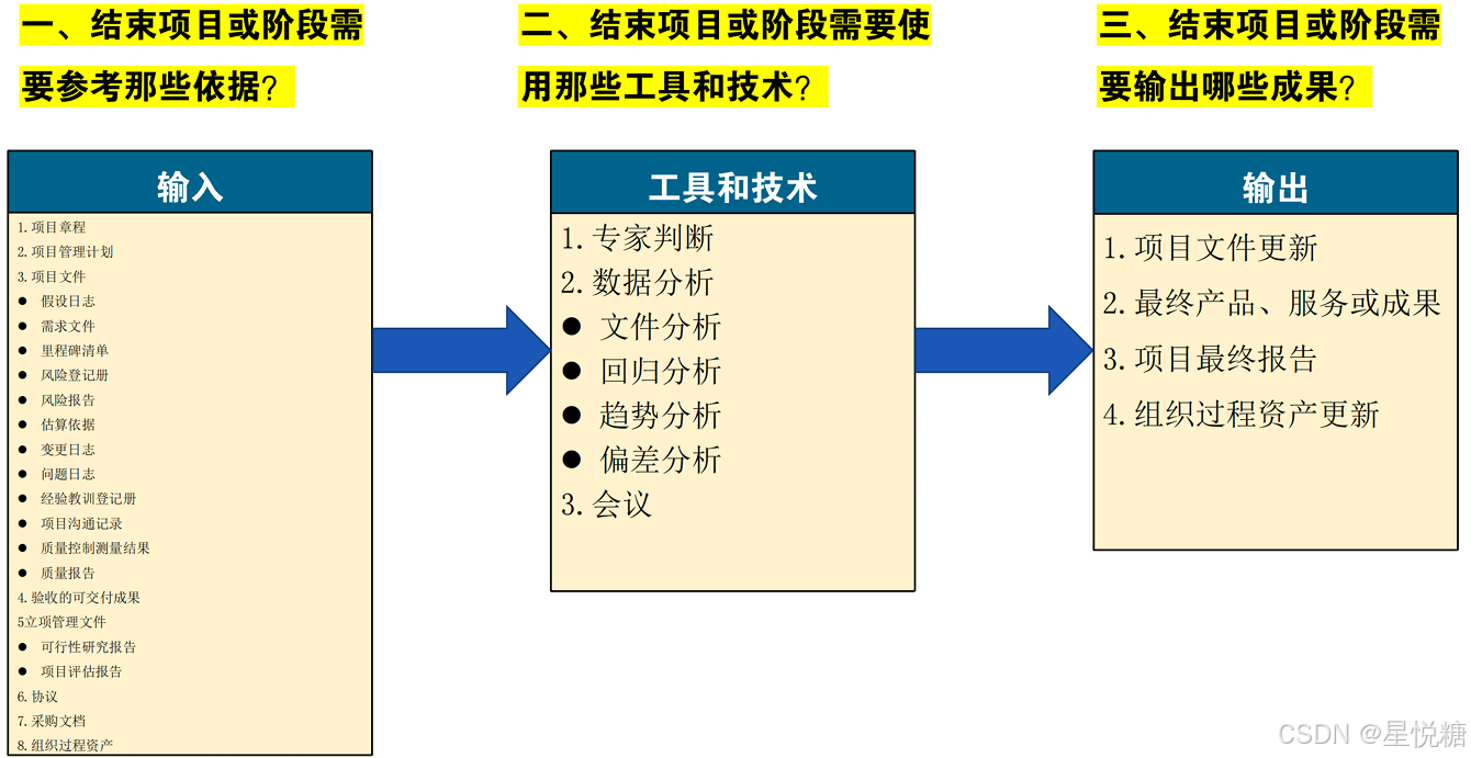 5、结束项目或阶段的输入、工具和技术以及输出都有哪些?