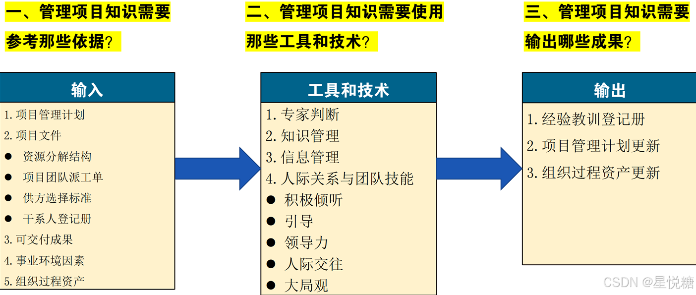 管理项目知识是使用现有知识并生成新知识,以实现项目目标并且帮助组织学习的过程。