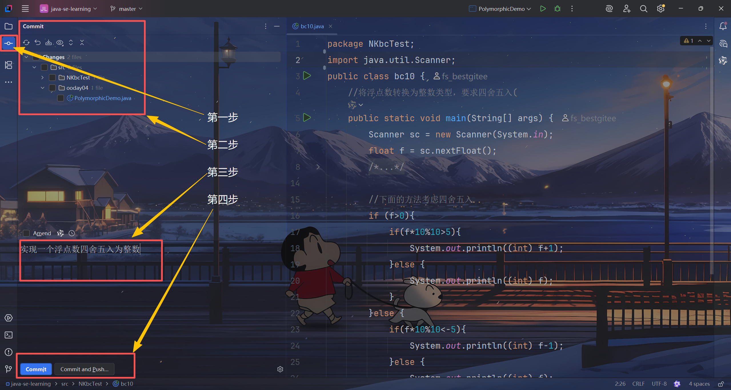 ② 代码提交与暂存:修改代码后,左侧「Commit」面板可查看变更文件,勾选需提交的文件(对应git add),在下方输入提交信息(对应git commit -m),点击「Commit」或「Commit and Push」完成提交与推送,如下图所示: