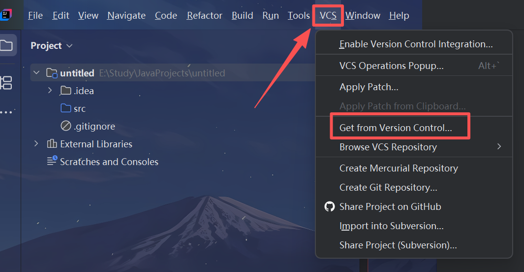 关联远程仓库可通过「VCS → Get from Version Control」输入仓库URL克隆,或本地仓库通过「VCS → Import into Version Control → Share Project on GitHub/GitLab」直接关联远程。如下图所示:
