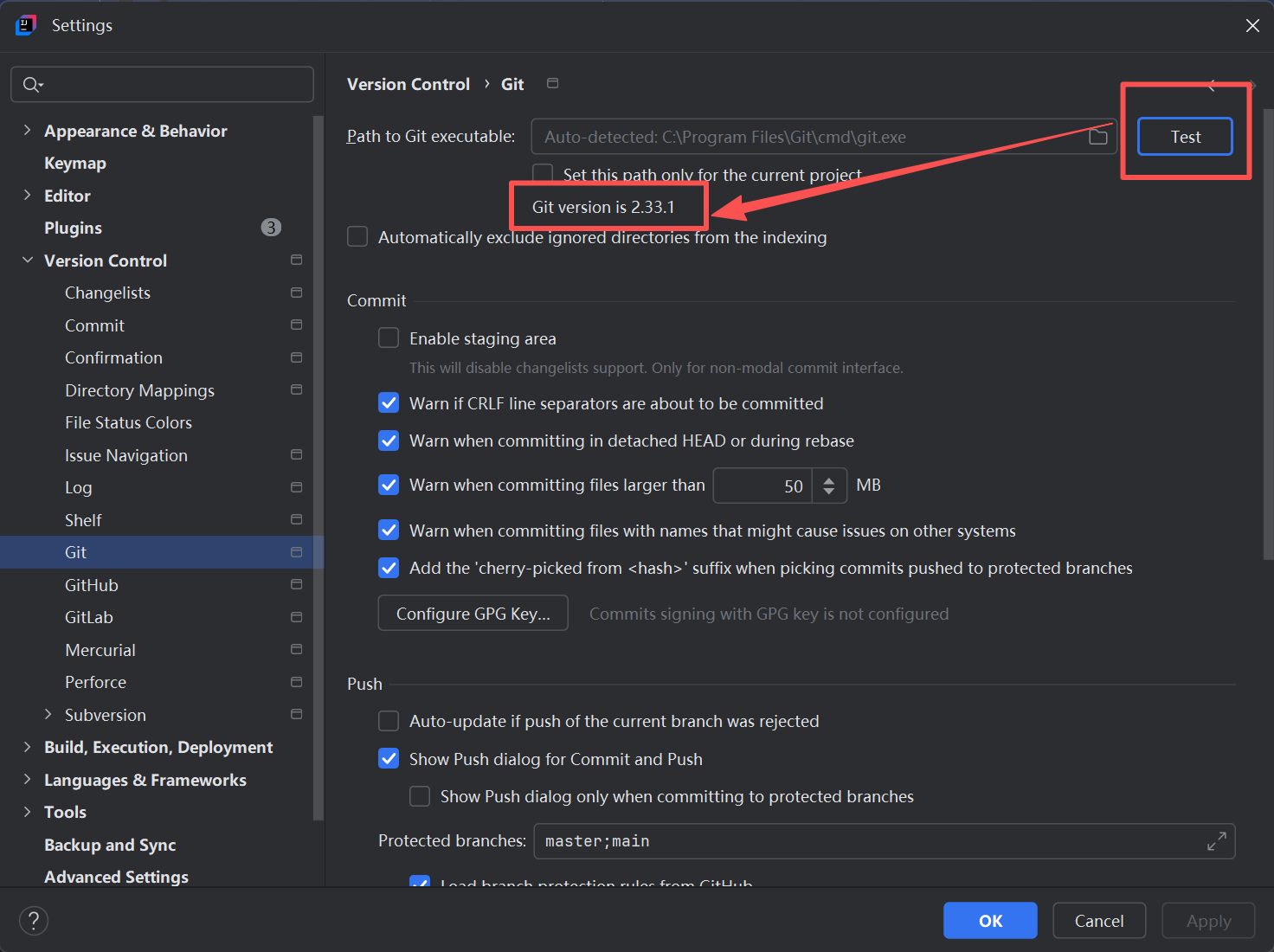 ① 初始配置与仓库关联:首次使用需在「File → Settings → Version Control → Git」中指定Git可执行文件路径(IDE通常会自动识别),如下图所示: