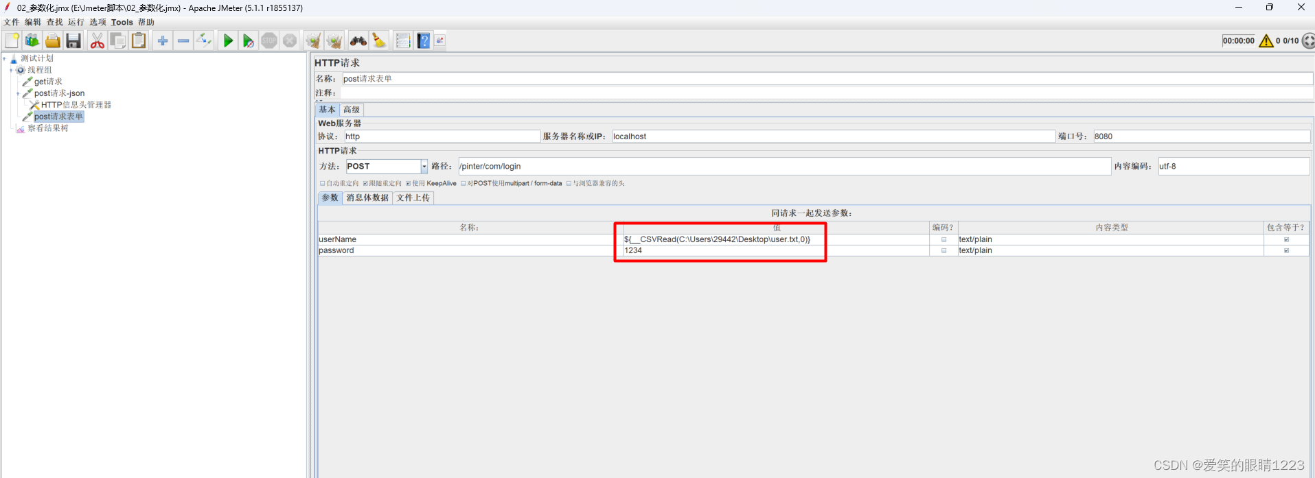 csv_read函数特点:每个并发用户只读取1行,且永远使用同一行数据,无论并发用户循环多少次,执行多少个http请求。