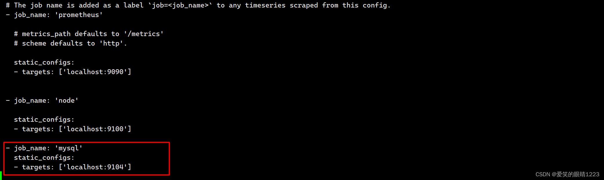 修改prometheus 的配置文件prometheus.yml, 增加监控MySQL的job(注意缩进格式)。