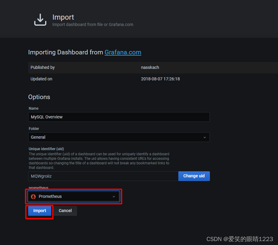 在Grafana中添加MySQL的监控模板 在grafana 官网模板中找到MySQL监控模板Mysql Overview,id为7362,并导入 到Grafana 中(具体操作步骤参考上面导入Linux监控模板操作)。