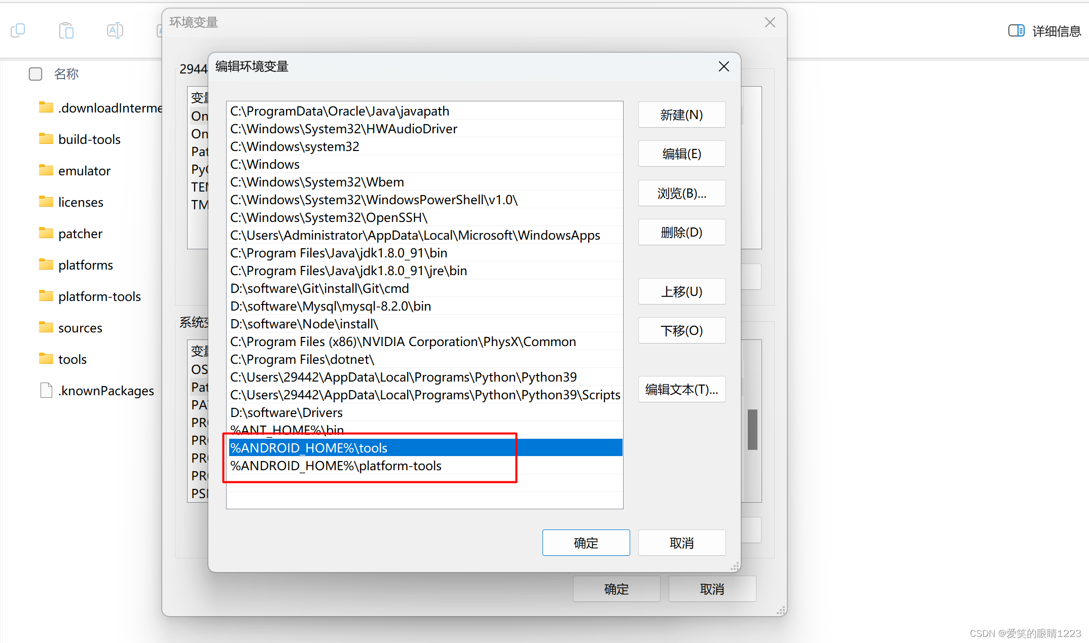 进入环境变量,在系统变量下新建ANDROID_HOME,维护Android_sdk的路径,在path中维护%ANDROID_HOME%\tools,%ANDROID_HOME%\platform-tools,点击确定按钮进行保存,如下图所示。