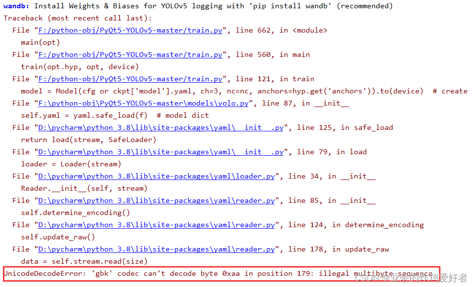 YOLOv5 报错:UnicodeDecodeError: ‘gbk‘ codec can‘t decode byte 0xaa in position 180: illegal multibyte YOLOv5 预训练模型报错记载