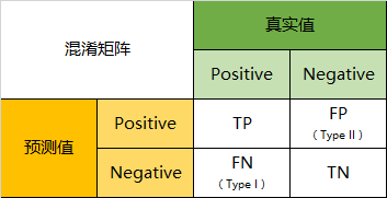 真实值是negative,模型认为是positive的数量(False Positive=FP):这就是统计学上的第二类错误(Type II Error)