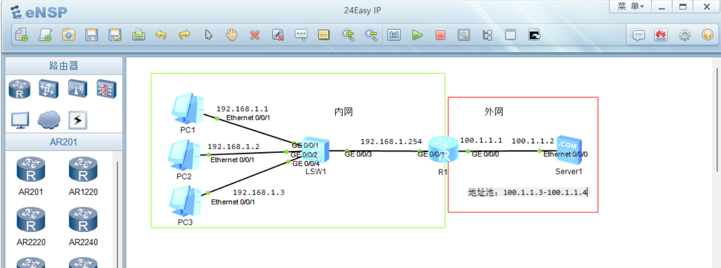 [R1]nat address-group 1 100.1.1.3 100.1.1.4 #创建NAT地址组1,包含两个公网IP:100.1.1.3和100.1.1.4