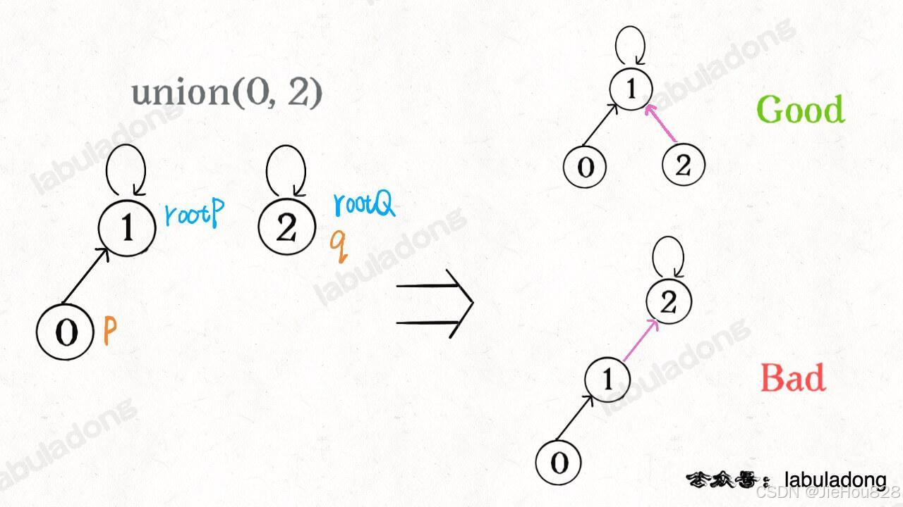 比如,在 union 的过程中我们可以判断每棵树下面的节点个数,然后把小树合并到大树的下边。这样通过比较树的重量,姐可以保证树生长相对平衡,使复杂度大概在【logN】数量级。