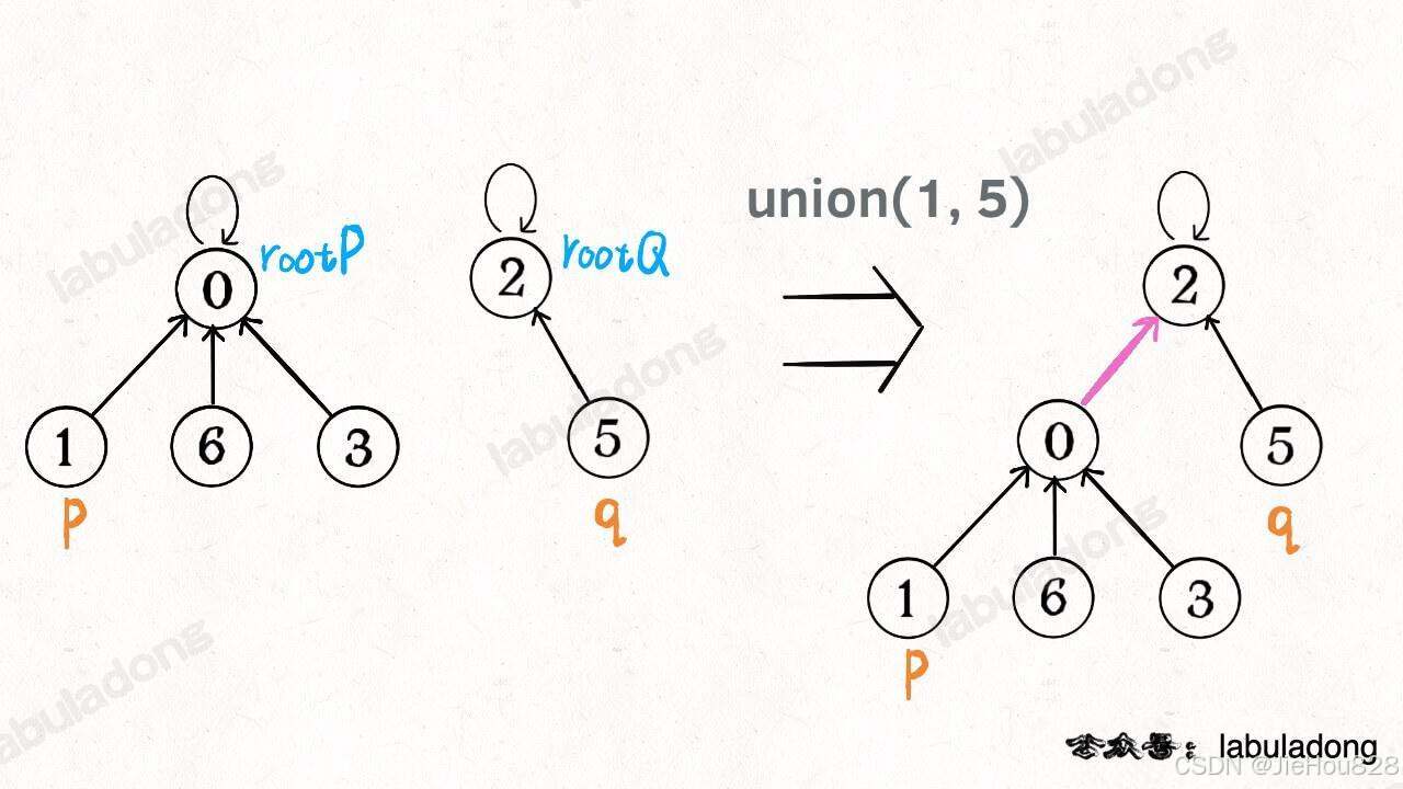 这样,如果节点 p 和 q 连通的话,它们一定拥有相同的根节点: