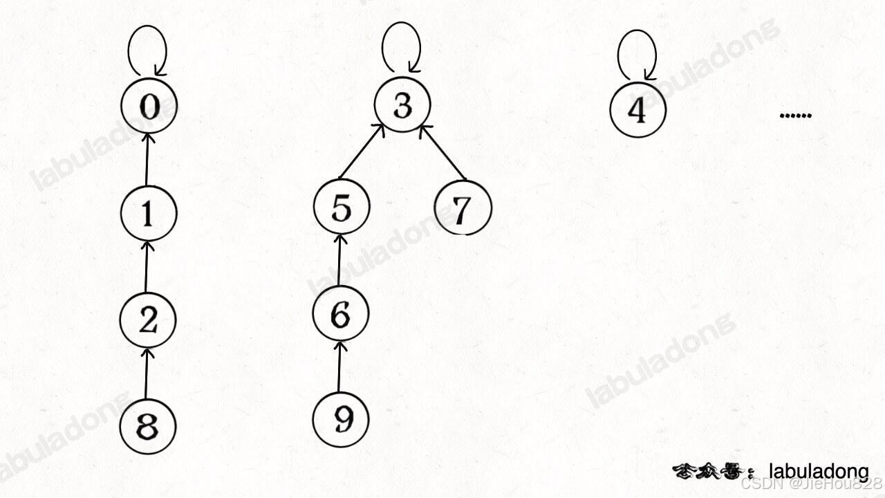 使用【森林】(若干树结构)来表示图的动态连通性,用【数组】来具体实现这个森林。设定树的每个节点有一个指针指向其父节点,如果是根节点的话,这个指针指向自己。