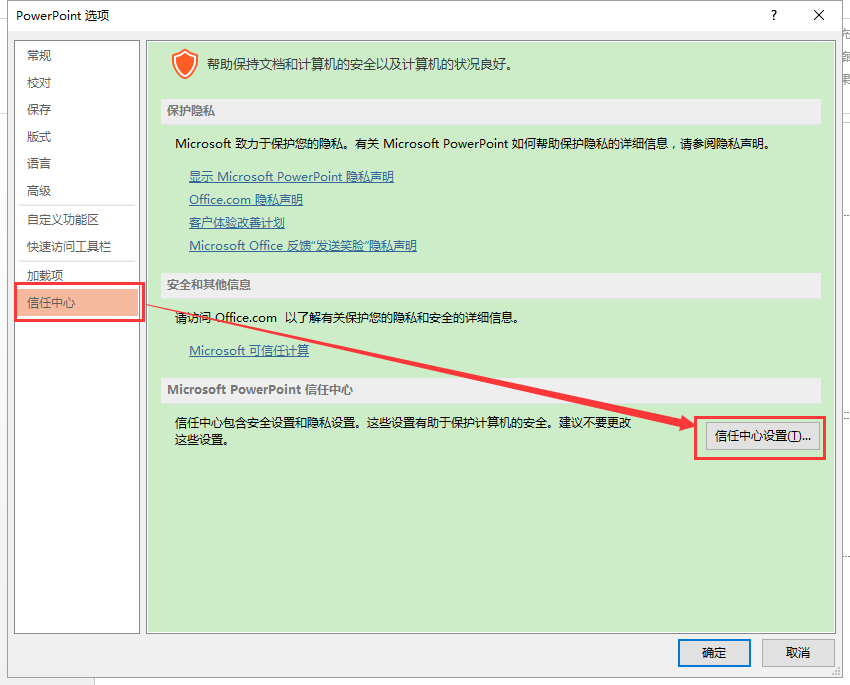2. 打开 “信任中心设置”,