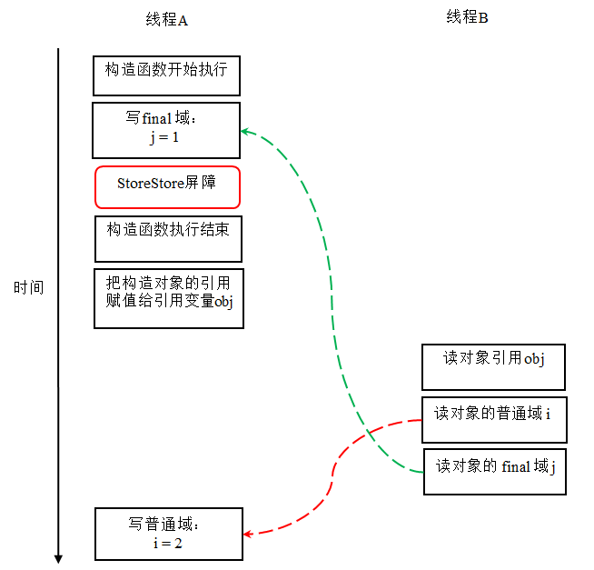 在上图中,写普通域的操作被编译器重排序到了构造函数之外,读线程B错误的读取了普通变量i初始化之前的值。而写final域的操作,被写final域的重排序规则“限定”在了构造函数之内,读线程B正确的读取了final变量初始化之后的值。