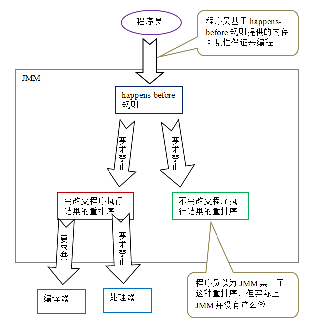 由于A happens- before B,happens- before的定义会要求:A操作执行的结果要对B可见,且A操作的执行顺序排在B操作之前。 但是从程序语义的角度来说,对A和B做重排序即不会改变程序的执行结果,也还能提高程序的执行性能(允许这种重排序减少了对编译器和处理器优化的束缚)。也就是说,上面这3个happens- before关系中,虽然2和3是必需要的,但1是不必要的。因此,JMM把happens- before要求禁止的重排序分为了下面两类: