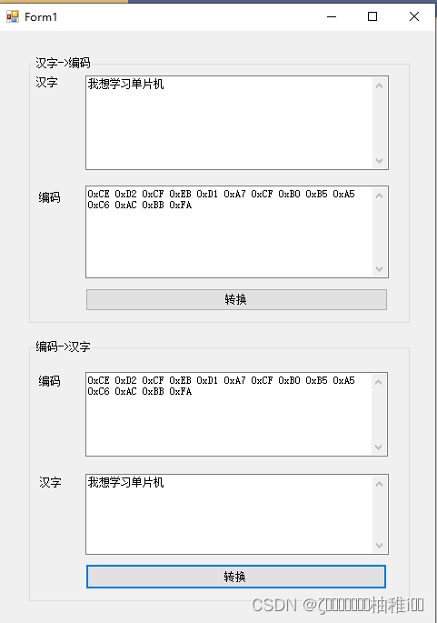 该文章展示了一个使用C#编写的窗体应用程序,该程序能进行汉字从UTF-8到GB2312的编码转换。代码包括两个主要方法:StringToBytes用于UTF-8到GB2312的转换,BytesToString则执行反向转换。用户可以通过文本框输入,点击按钮查看编码结果。程序还处理了用户输入的16进制字节串转换回字符串。