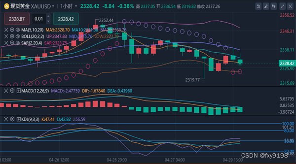 【黄金消息面分析】:周一(4月29日)亚市早盘,现货黄金窄幅震荡,目前交投于2328美元/盎司。金价上周五反弹受阻,收报2337.36美元/盎司,此前数据显示美国物价升幅符合预期;随着中东危机避免重大升级后,一些地缘政治风险溢价回落,金价周线仍下跌逾2%,创下12月以来最差周度表现。黄金价格上周开始面临巨大的看跌压力,周一创下今年最大单日跌幅。金价在上周下半周成功反弹,但周线仍然收低。在伊朗和以色列冲突的消息相对平静的周末之后,地缘政治紧张局势有所缓解,金价在上周初掉头下跌。在过去几周受益于避险资金流动并录得令人印象深刻的涨幅之后,金价上周一出现调整,单日暴跌2.7%。如果鲍威尔对最近的通胀发展采取担忧的语气,美元可能兑其竞争对手保持弹性,限制黄金的上行空间。最后,如果鲍威尔淡化令人失望的第一季度GDP数据,投资者可能会将其视为鹰派论调,从而使黄金难以获得上行动力。美联储的货币政策公告和美国4月份的劳动力市场数据可能会推动未来一周黄金的走势。