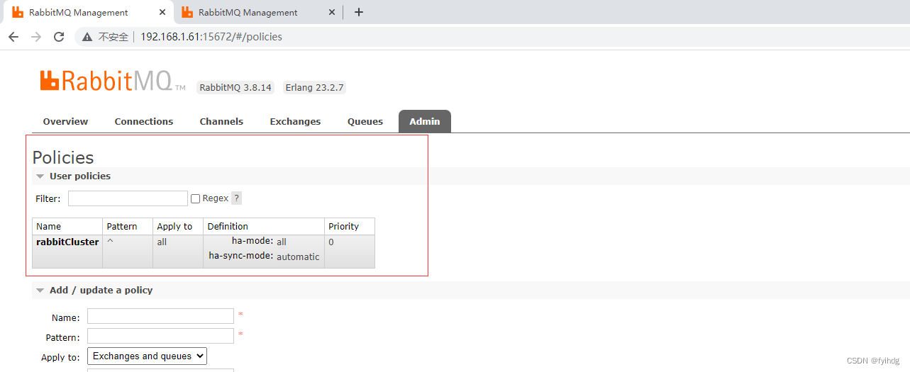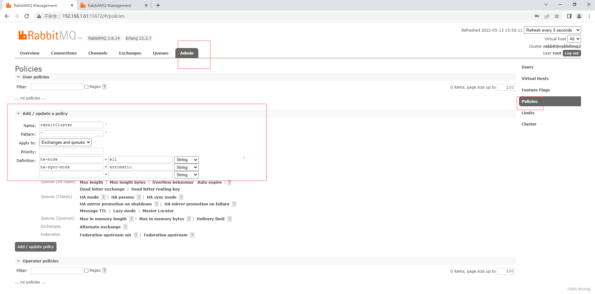 这样的方式还不够完善,一台挂了,另一台就无法消费消息了,所以, 要设置镜像模式: