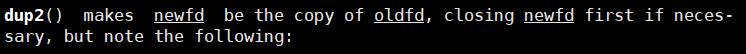 此函数传入的参数分别为:另外打开的文件的文件描述符oldfd,待被重定向的文件的文件描述符newfd,它做的事情就是把oldfd的指针内容拷贝覆盖到newfd中。