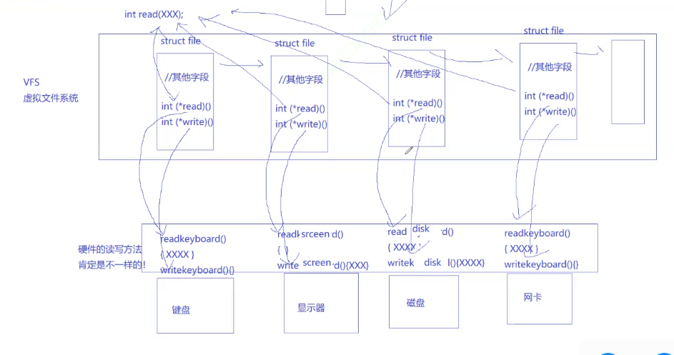 是这样没错,所以我们对这些不同的设备的读和写用的是不同的函数,但我们在管理文件时,想进行读或写时,利用函数指针来实现回调函数,用read指针指向指定设备的读方法,write指针指向指定设备的写方法
