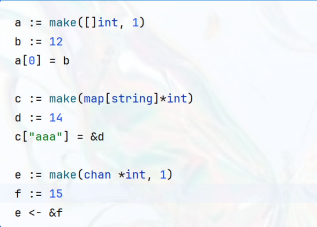 b不会发生内存逃逸,d和f会发生内存逃逸,被指针类型的 slice 引用