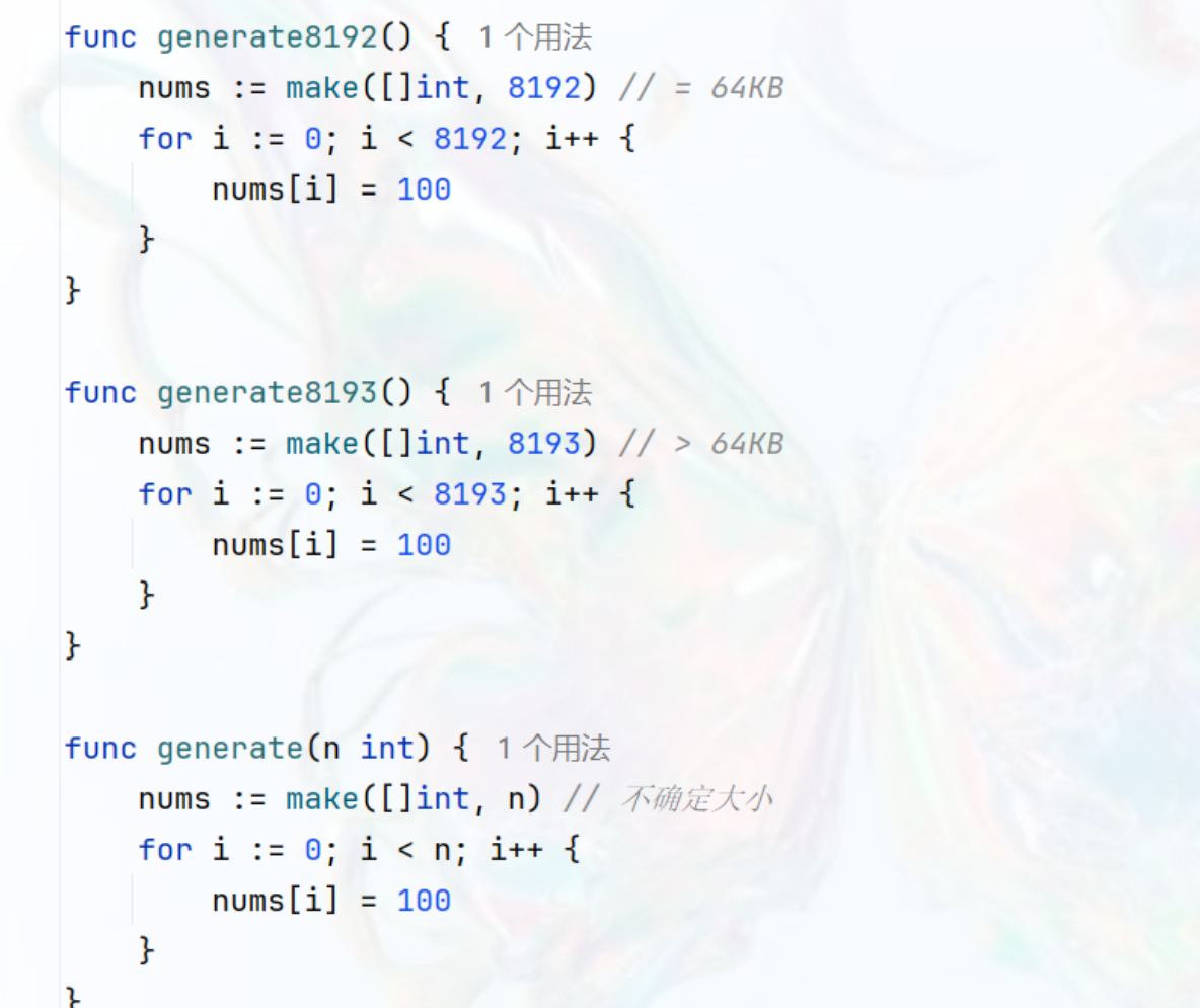 generate8193() 创建了大小为 8193 的 int 型切片,恰好大于 64 KB。会发生逃逸 generate(n),切片大小不确定,调用时传入。会发生逃逸