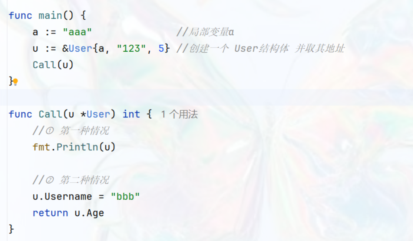 ① 第一种情况: 会发生内存逃逸,因为存在被已经逃逸的变量引用的指针情况(演示时会给大家看Println的源码)