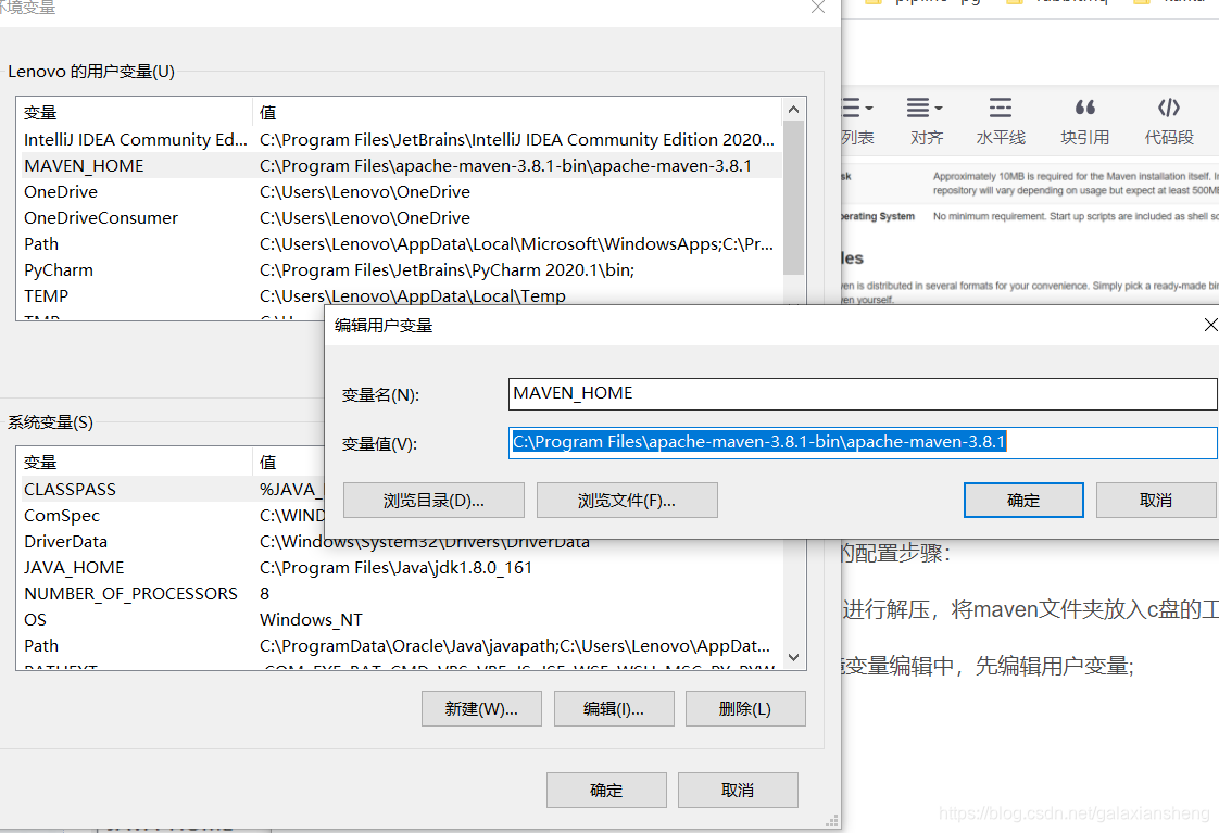 2.进入windows的环境变量编辑中,先编辑用户变量,创建:MAVEN_HOME,变量值是:maven工程目录的绝对路径。