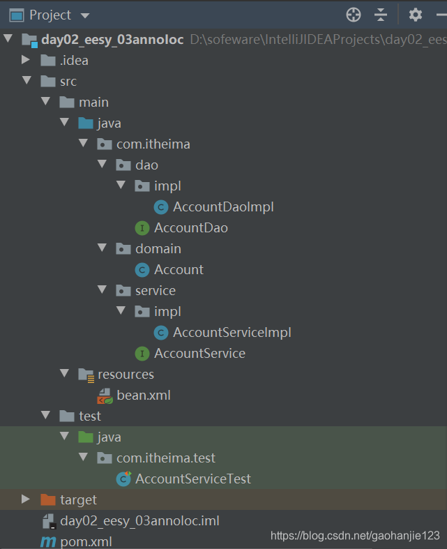 该博客介绍了如何在Spring框架中采用半注解半XML配置的方式来实现IoC容器的管理。案例涉及数据库account表的CRUD操作,通过注解处理项目中的自定义类和关系,而XML文件用于处理注解扫描、类库中的bean创建及依赖注入。文章详细讲解了项目的目录结构、pom.xml配置、domain包中的Account类、dao层、service层的实现,以及bean.xml配置文件和测试类的编写。