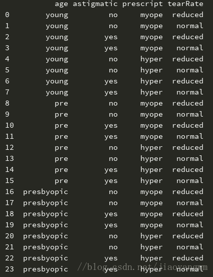 lensesLabels = ['age', 'prescript', 'astigmatic', 'tearRate']