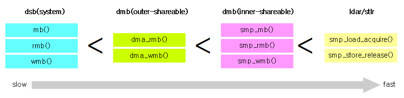 For devices, we added commands to Kernel v3.19-rc1 that can be shared to the Outer Share region, which is lighter than RMB() and WMB() and heavier than SMP-enabled barriers.