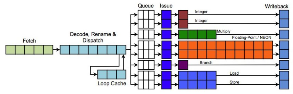 - 比如有五种处理类型(Integer, Multiply, Floating-Point/NENO, Branch, Load/Store),被不同的指令引入;那么,由于他们分属于不同的单元处理,所以,是可以在同一时间被处理的。不过,他们的完成时间是各不相同的。integer操作的处理时间是最短的,所以最先完成。