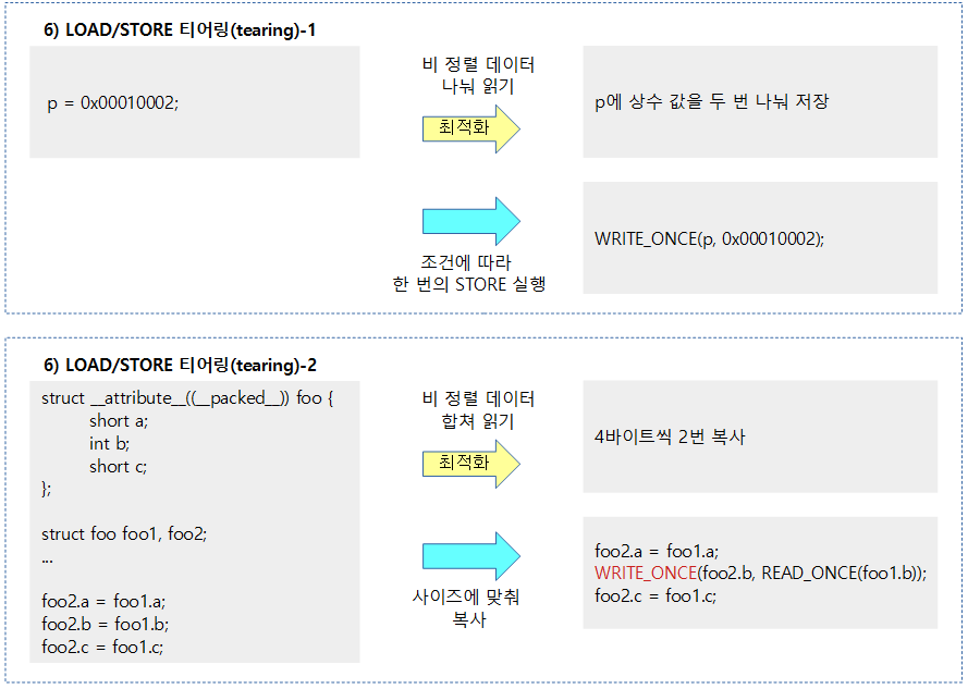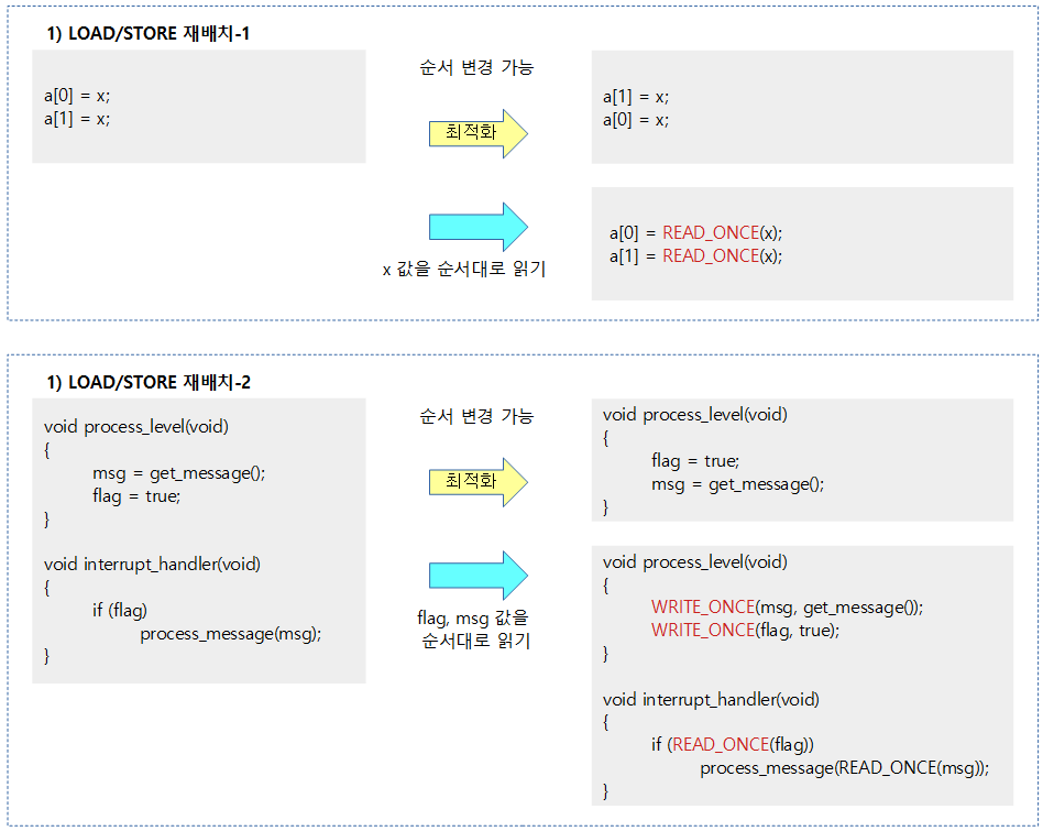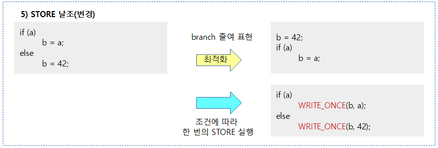 - STORE operations are not performed predictably by the compiler, so they ensure order with other LOADs and STOREs. Still, it doesn't work as a conditional dependency barrier.