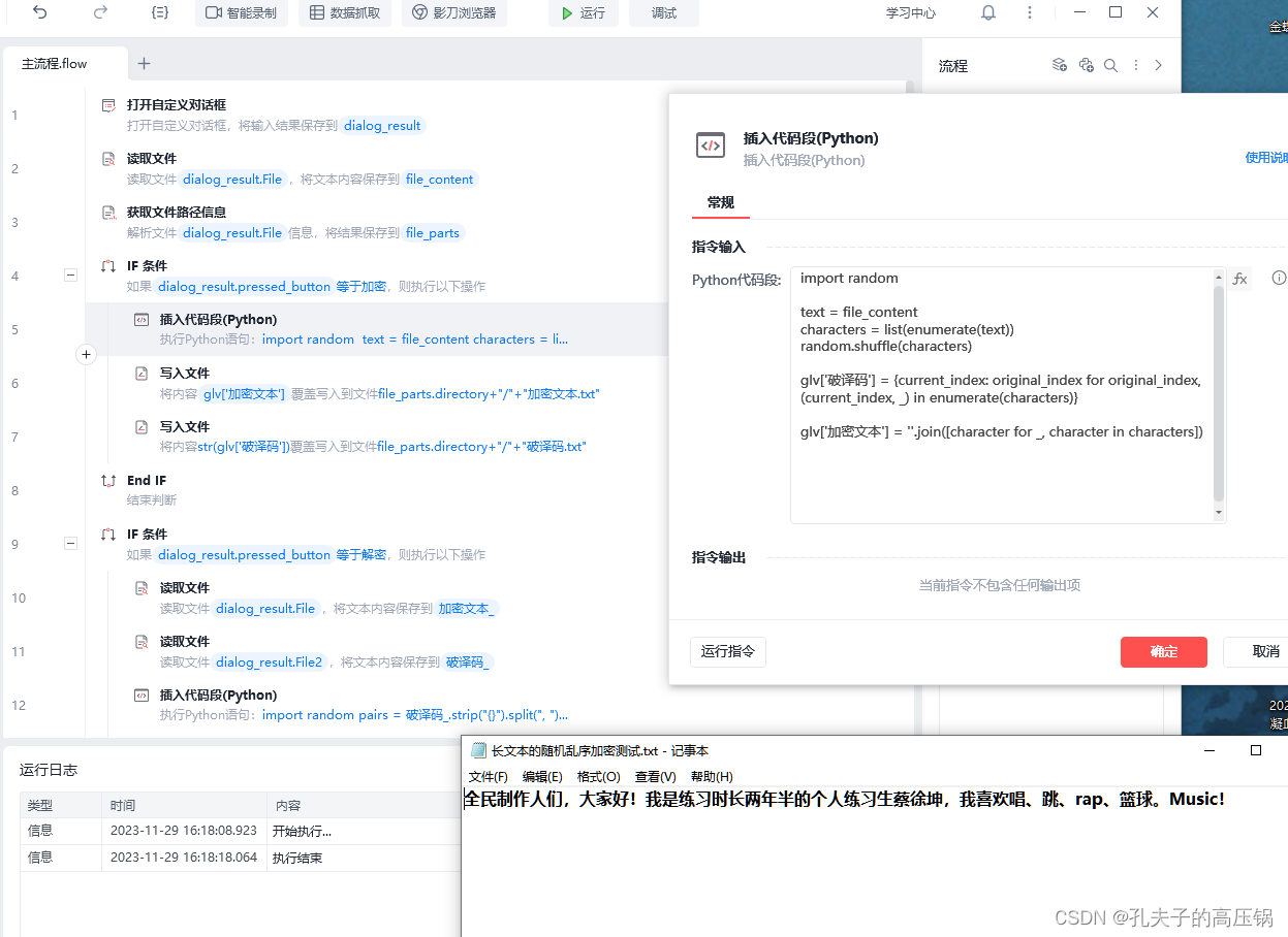 本文意在利用影刀指令+python代码,实现一种较为简单的长文本加密和解密,流程结构分为两步: