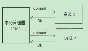 图1显示的就是第一阶段提交的情况,可以看到,参与操作的是事务管理器与两个资源。