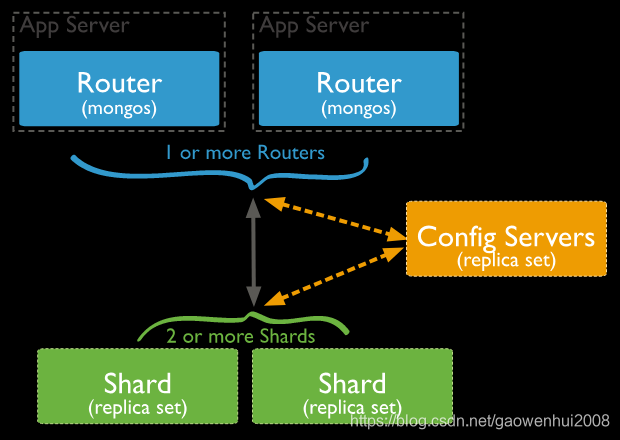 从图中可以看到有四个组件:mongos、config server、shard、replica set。