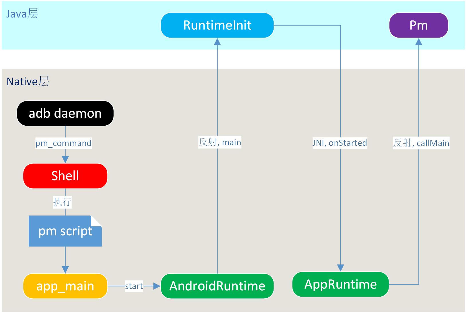 这里的情况是类似的,adb进程发送消息给Shell服务,Shell服务执行Pm脚本,由于exec函数并未创建出新的进程,因此调用app_main后整个代码仍然是运行在Shell服务对应的native进程中,同样通过反射后演变为Java层中的进程。