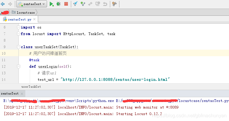 (1)如果使用pycharm作为开发工具,可直接点击“运行”按钮,启动locust