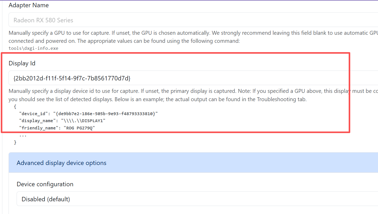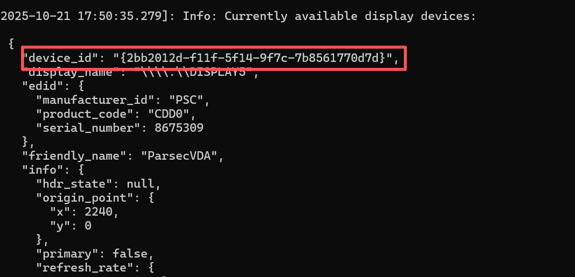 关键点是否输入正确的Virtual display ID,VDD里的ID在parsec-vdd软件看不到,需要通过查看sunshine启动日志查询,如下: