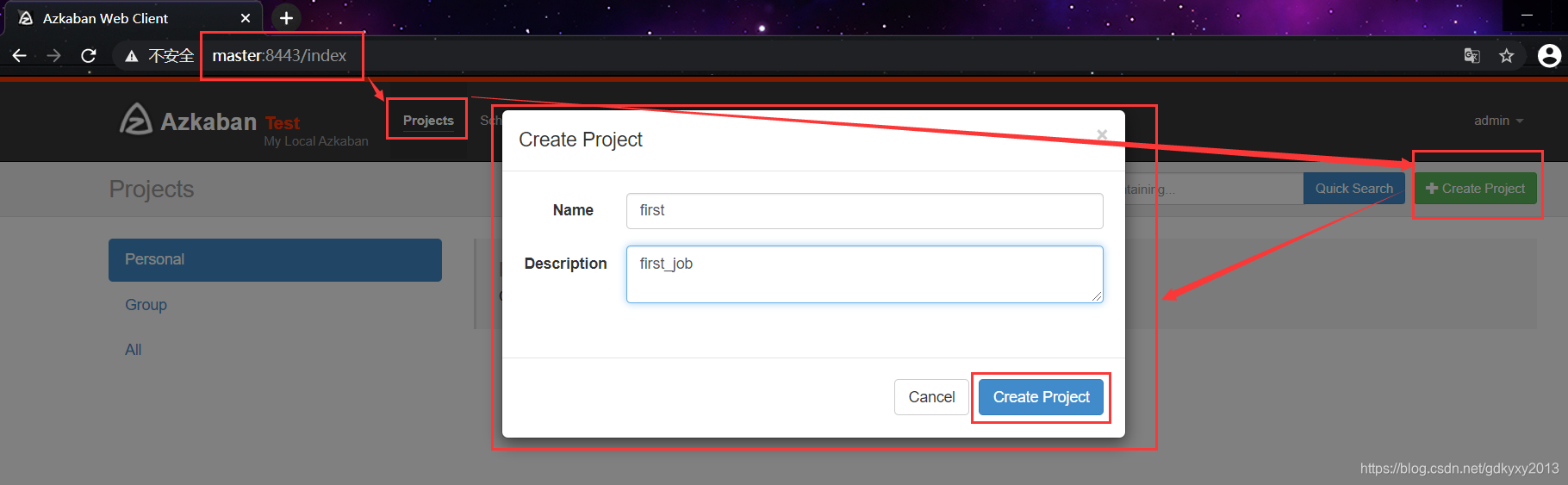 4、在Azkaban监控界面新建项目,上传文件并执行