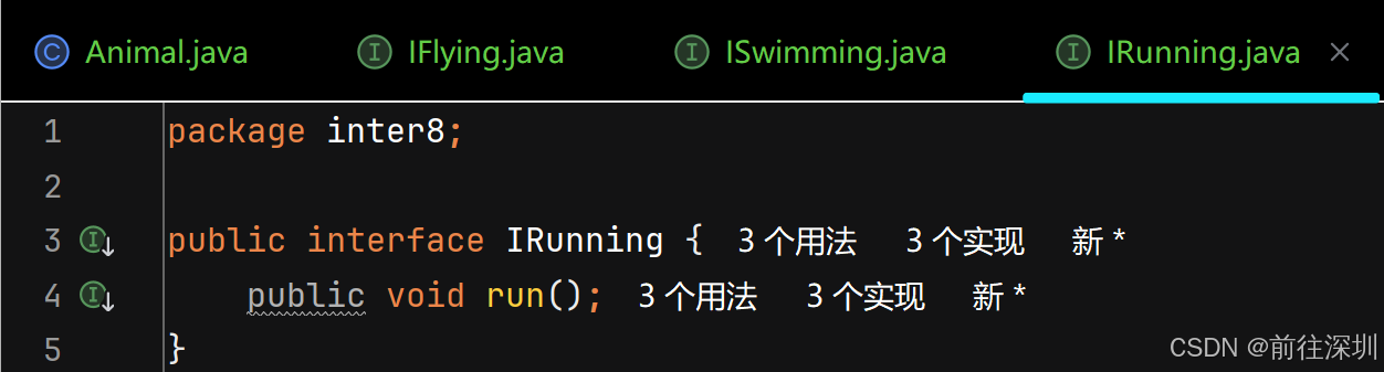 (4):定义了一个IRunning接口,并定义了一个run方法,这里的方法默认是public abstract修饰,所以加不加public都可以。