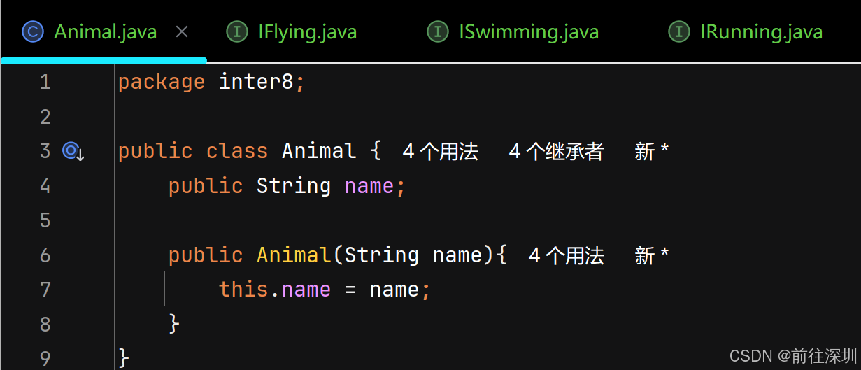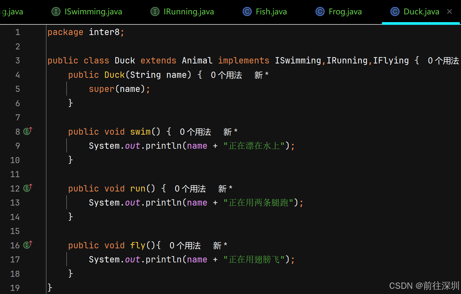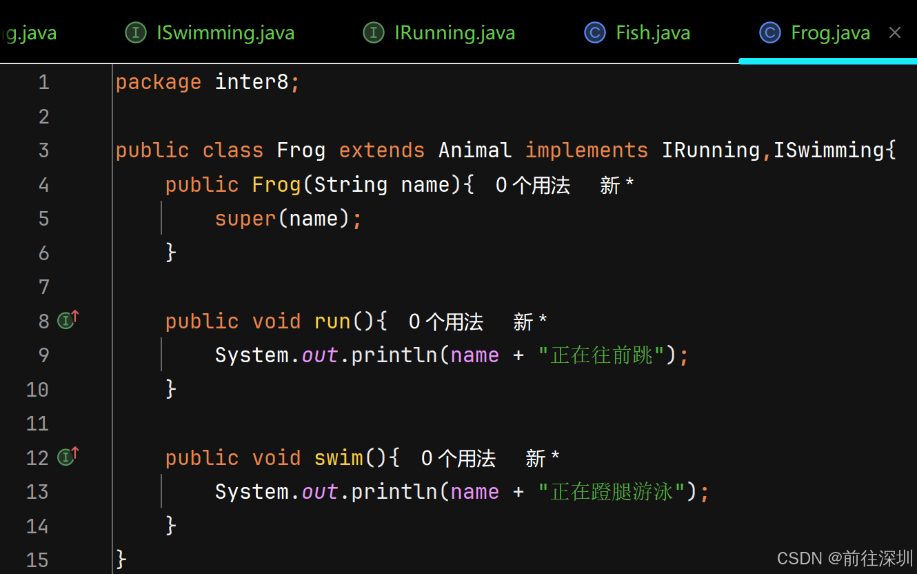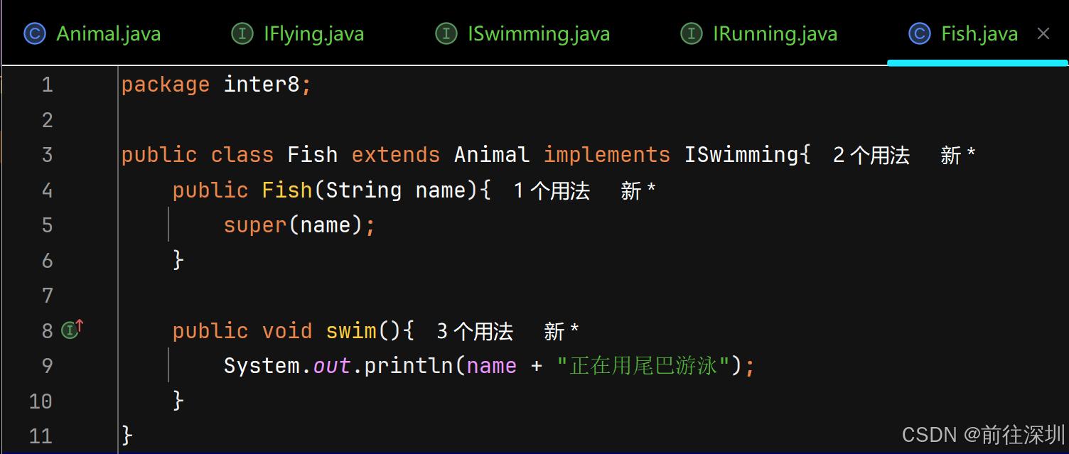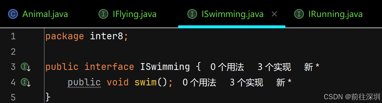 (3):定义了一个ISwimming接口,并定义了一个swim方法,这里的方法默认是public abstract修饰,所以加不加public都可以。