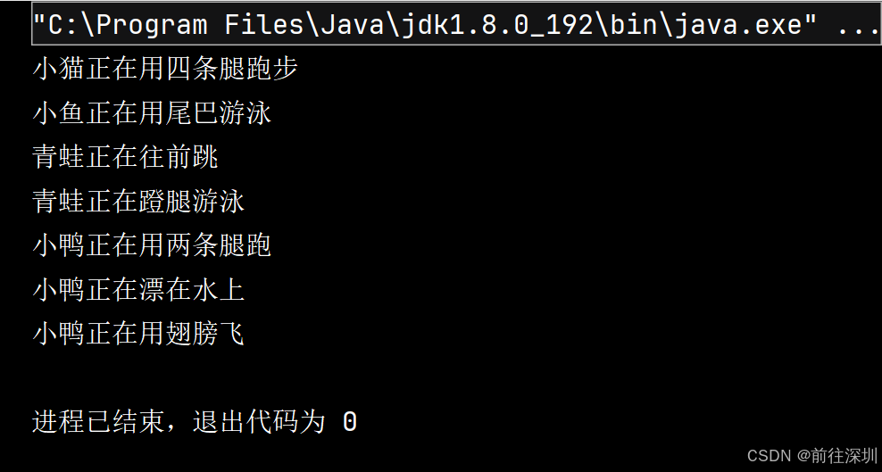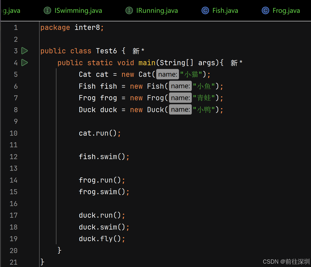 (8):最后的测试类Test6,在main方法中,分别通过各自的类名实例化对象cat、fish、frog、duck,然后各自相应调用属于自己的方法并打印语句。不能直接通过接口实例化对象!