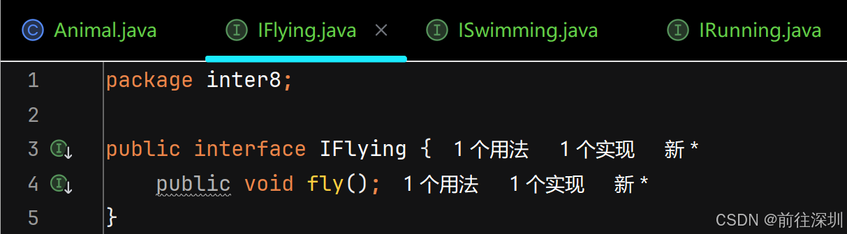 (2):定义了一个IFlying接口,并定义了一个fly的抽象方法,这里的方法默认是public abstract修饰,所以加不加public都可以。