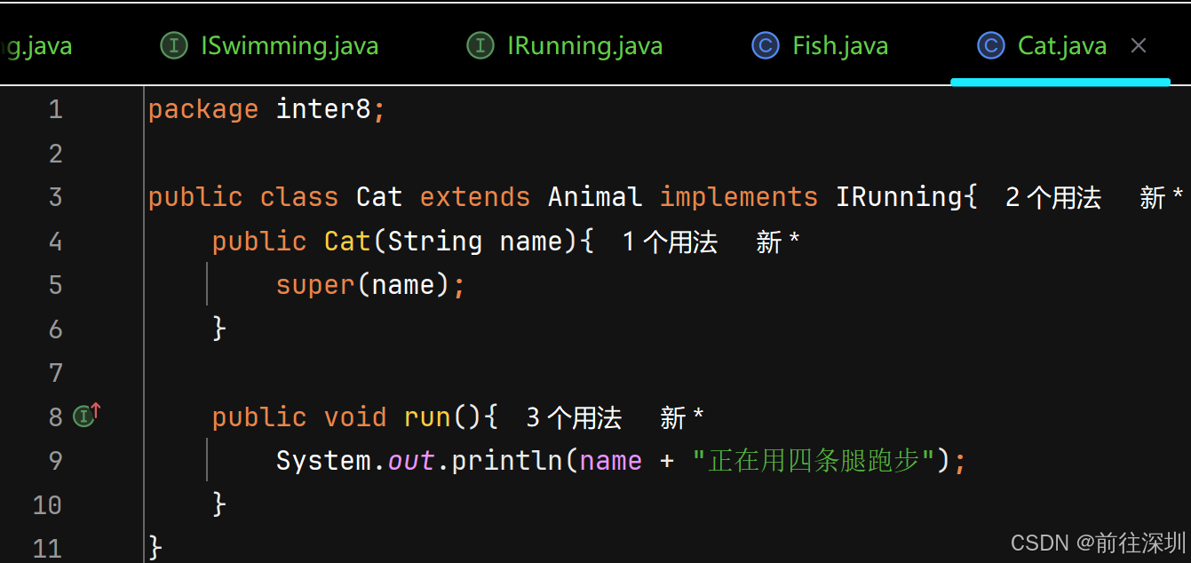 (6):定义了一个Cat子类,继承父类Animal,并实现接口IRunning,因为猫只会跑,不会跑和游泳。给出了一个有参构造方法,并重写run方法,打印跑的语句。