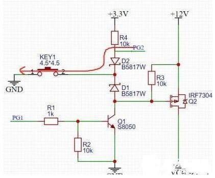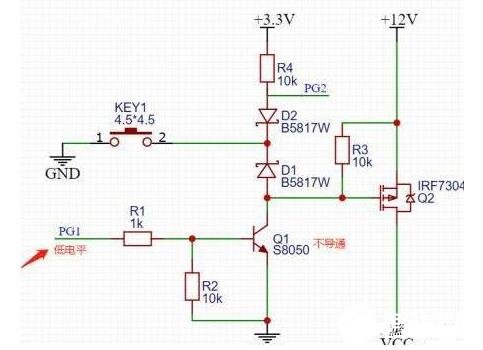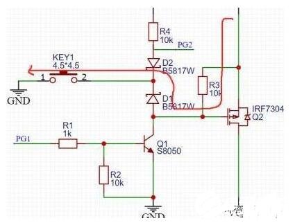 按键没按下之前,PMOSGS两端电压一样,不导通,当按键按下之后,看上图红色回路,G极通过二极管D1接地,PMOS导通,12V电压通过PMOS到VCC,给后级供电,这时候有老铁就要问了,难道我要一直按着嘛,按键松开的话MOS不就关断了