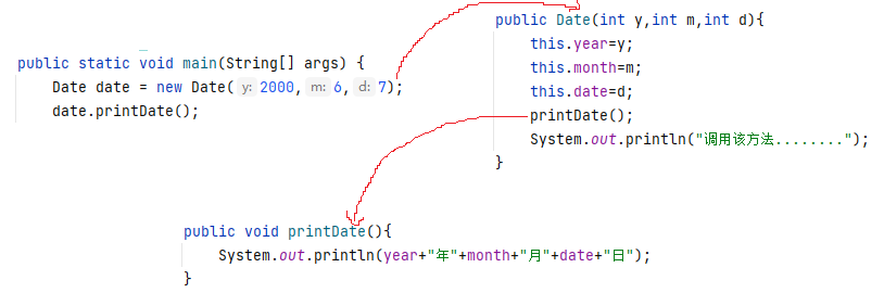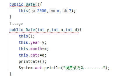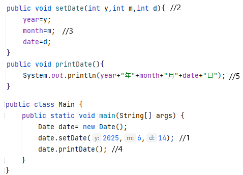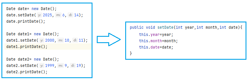 public void setDate(Date this //作为隐藏的第一个参数传递值,可省略。 ,int year,int month,int date){