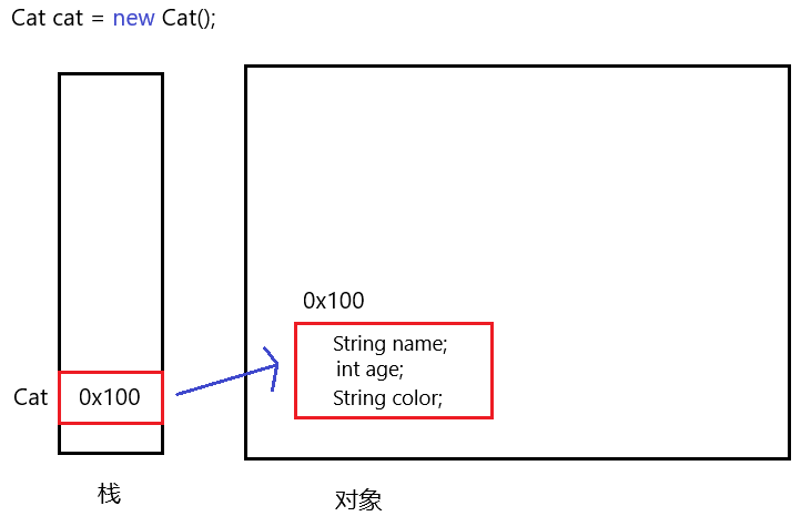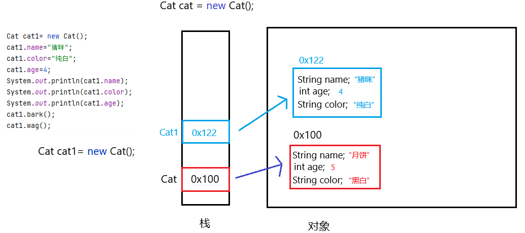 //类 class Cat{ // 成员变量 public String name; public String color; public int age; //成员方法 public void bark(){ System.out.println("喵喵喵....."); } public void wag(){ System.out.println("竖尾巴......"); } }Cat cat = new Cat(); Cat cat1= new Cat(); 由 类 生成 对象的 过程 叫做实例化。或者这么理解, 对象是 被实例化 的 类。