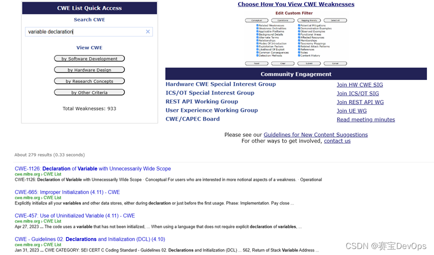 同时,可结合相关的标准进一步筛选代码规则。Sonarqube内置的标准包括OWASP、CERT、CWE等,OWASP和CERT与安全有关,将在后续的主题中介绍,CWE(Common Weakness Enumeration)是一个常见软硬件弱点类型的清单,不仅包括安全漏洞,也包括其它方面的质量弱点,在其官网提供了查询功能,通过相应的关键字能够查询到对应的弱点描述及编号,再用其CWE编号到Sonarqube中即可搜索出对应的规则。