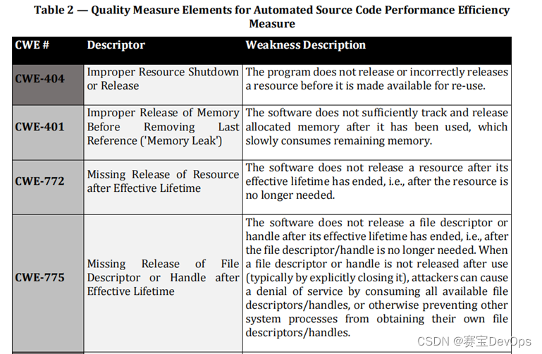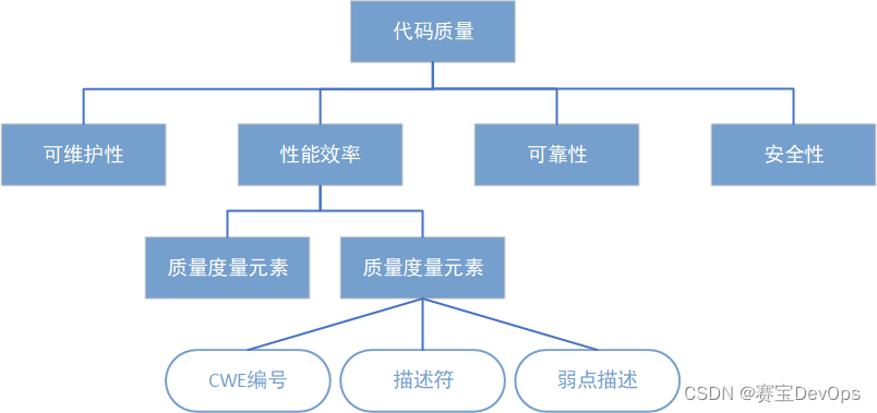 然而上面这些都不够系统,小开希望有一个成体系的代码规则,团队可以根据不同的需求进行裁剪。《ISO/IEC 5055:2021 -自动化源代码质量度量》这一标准则比较系统性地给出了代码质量的若干特性,以及每个方面特性对应的CWE有哪些。ISO/IEC 5055:2021将代码质量分为可维护性、性能效率、可靠性、安全性四大特性,每个特性下有若干质量度量元素,并描述了每个质量度量元素的CWE编号、描述符、弱点描述、和其它CWE的继承关系等。